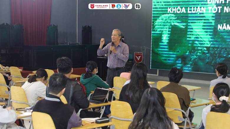 Trong buổi định hướng, TS. Phan Thế Hưng – Trưởng Khoa Ngoại ngữ đã chia sẻ nhiều thông tin quan trọng về quy trình thực hiện khóa luận, từ cách lựa chọn và xây dựng đề tài, phương pháp nghiên cứu khoa học, cho đến yêu cầu về hình thức trình bày và tiêu chí đánh giá. Bên cạnh đó, thầy cũng nhấn mạnh ý nghĩa của khóa luận tốt nghiệp, đồng thời làm nổi bật tầm quan trọng của việc nghiên cứu khoa học trong quá trình học tập và phát triển năng lực chuyên môn của sinh viên.