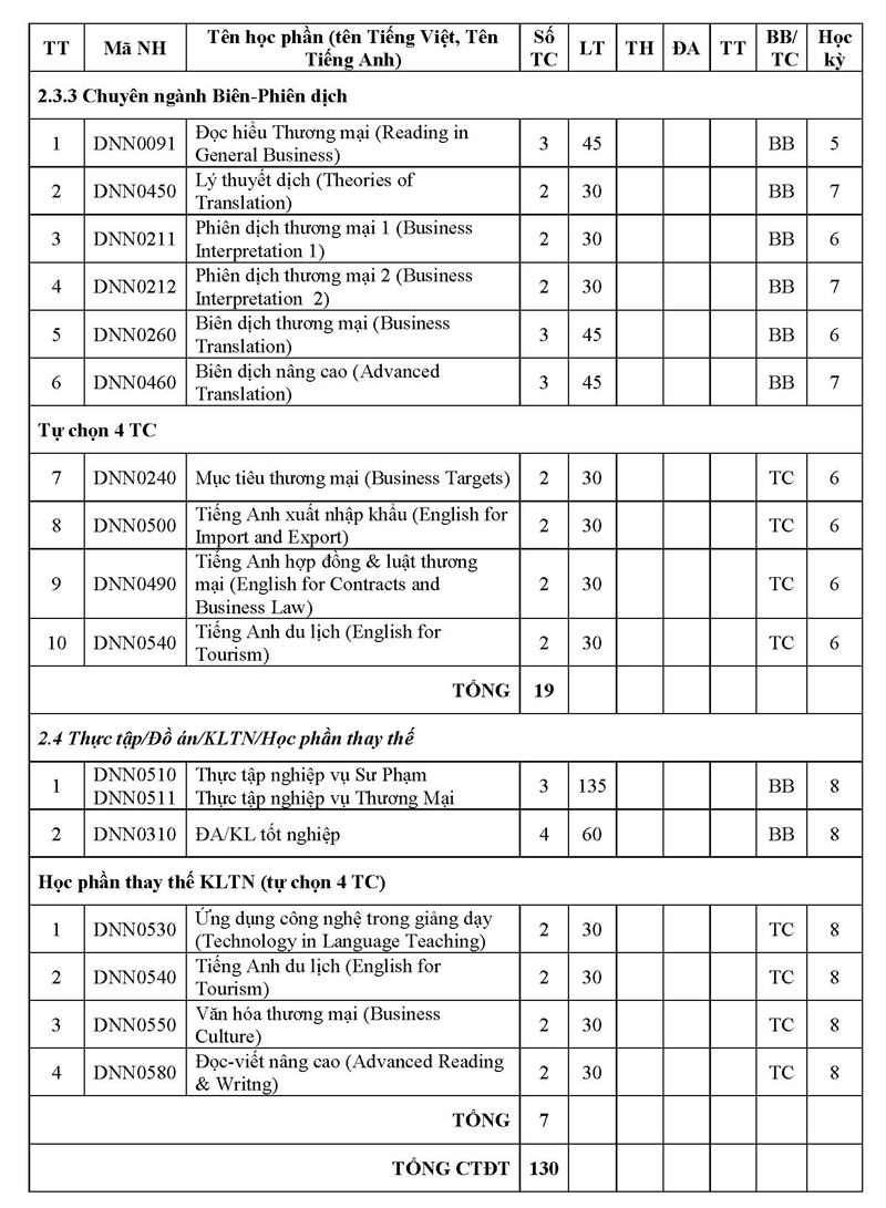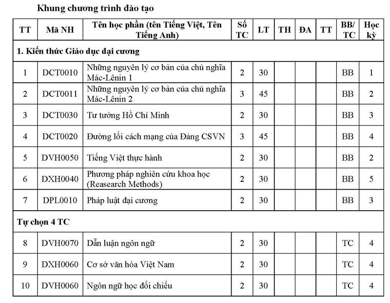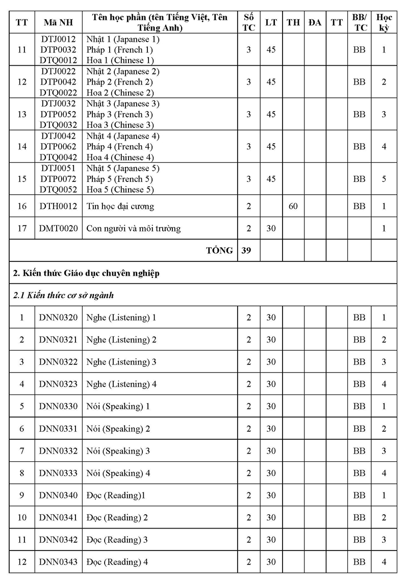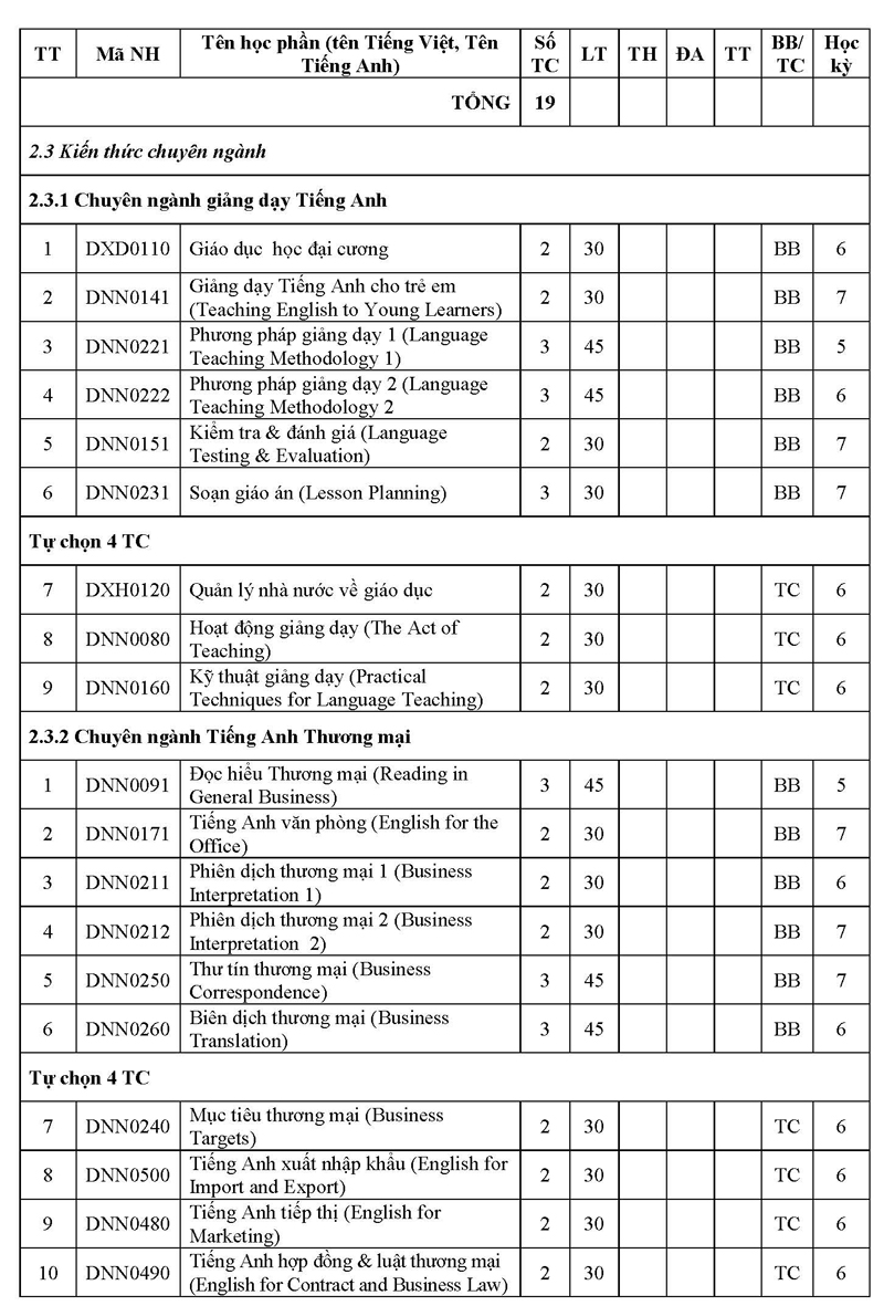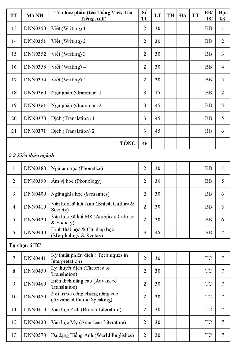 BẢNG CHI TIẾT CÁC MÔN HỌC NGÀNH NGÔN NGỮ ANH