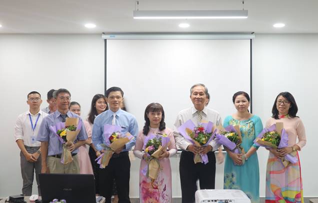 Hội đồng BVKL nhận hoa từ các SV tham gia bảo vệ khóa luận (từ trái qua): ThS. Đỗ Phú Anh; ThS. Đường Thanh Hùng Đức; ThS. Ngô Thị Cẩm Thùy; TS. Phan Thế Hưng; ThS. Lê Thị Ngọc Diệp; ThS. Phạm Thị Thùy Trang.